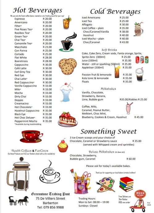 Welcome to the Greenstone Trading Post, a charming art café nestled at 75 De Villiers Street in Barberton, South Africa. This delightful spot offers a perfect blend of creativity and culinary delight, making it a must-visit destination for art enthusiasts, food lovers, and anyone in search of a cozy corner to relax.